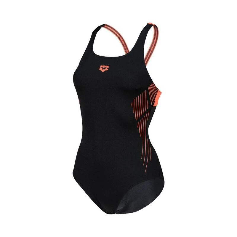 Het zwart met oranje Streak Pro rugzwempak is voorzien van een Arena logo-opdruk waarmee je opvalt bij je volgende bezoek aan het zwembad.