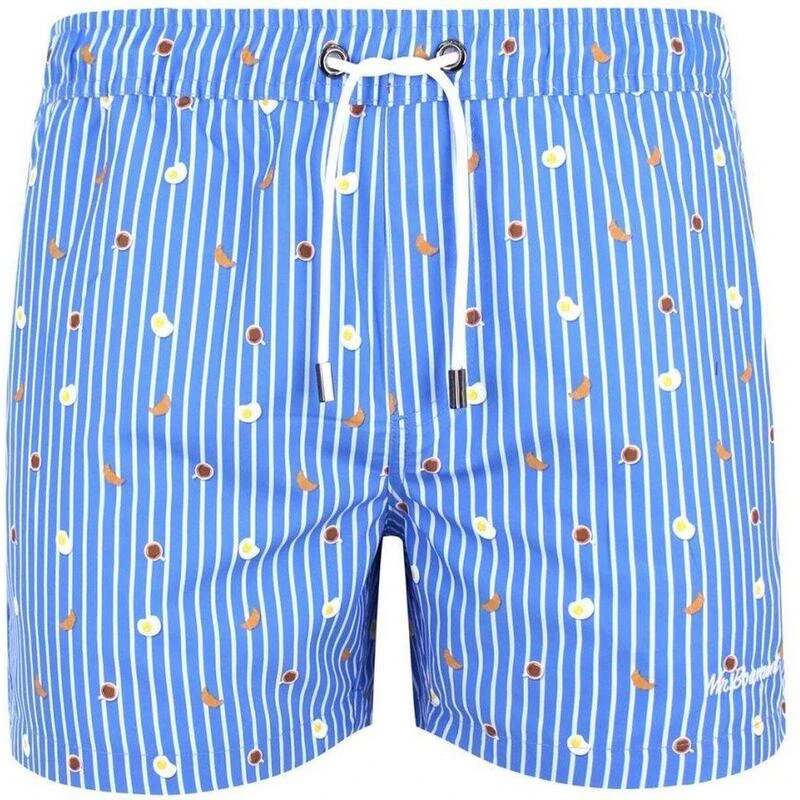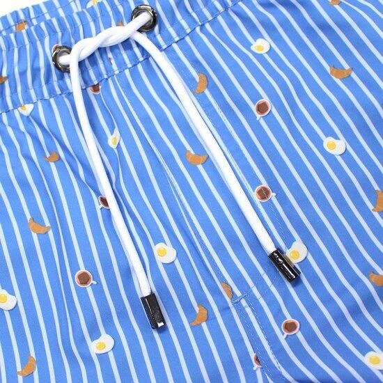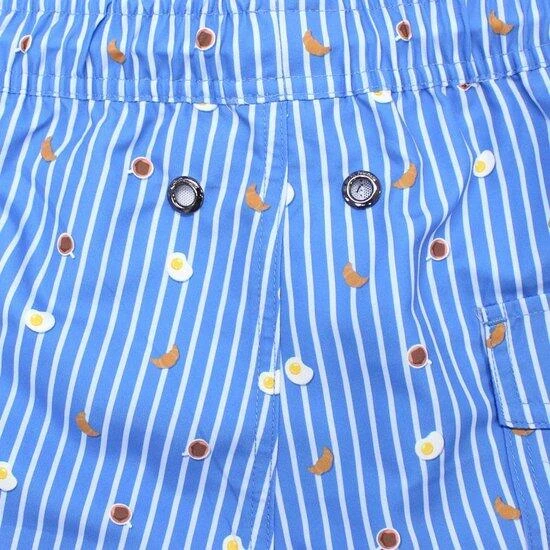 Petit Dejeuner is een Blauw/Wit gestreepte zwemshort met een relatief korte pasvorm.